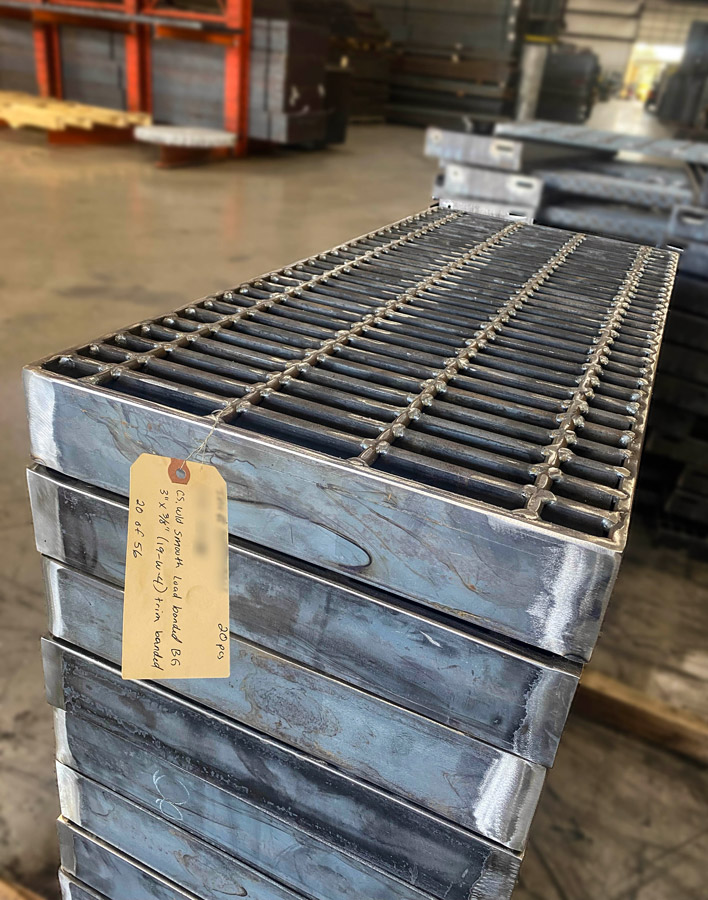 Bar grating stair treads can be fabricated for certain sizes and with different bearing bar widths. Below are 2 different projects. The first is steel bar grating stair treads with serrated surface and checker plate nosing. And the second is where our team cut and welded custom-sized stair treads with weight-bearing stabilizer bars to our clients’ specs.