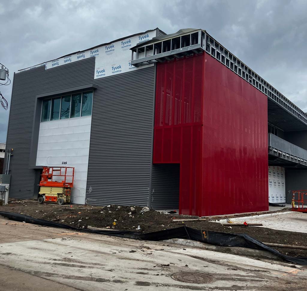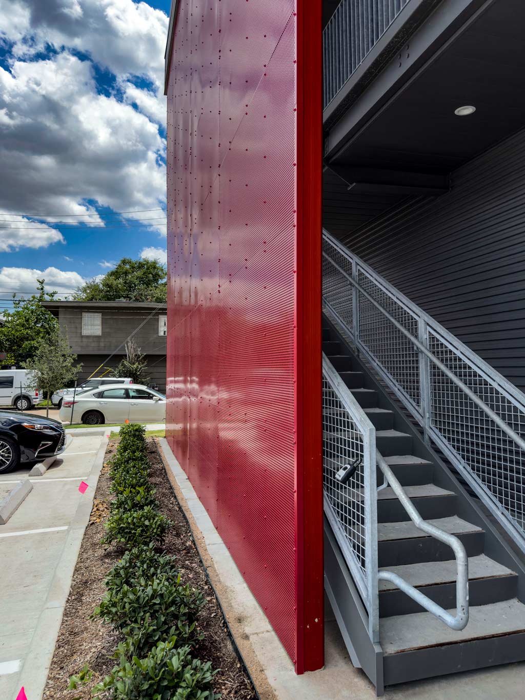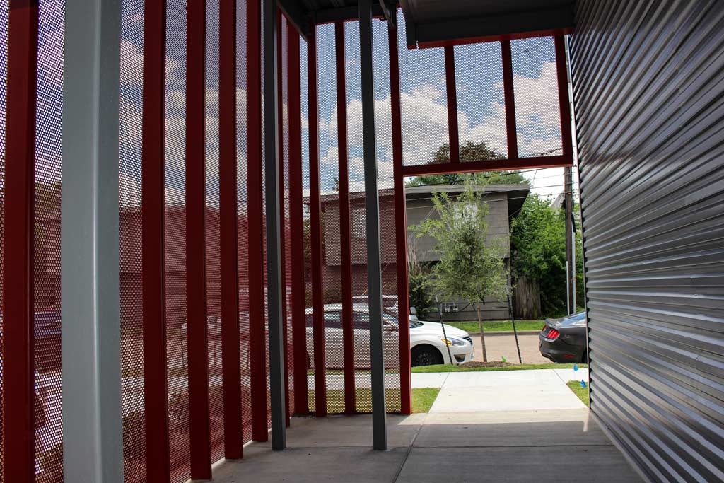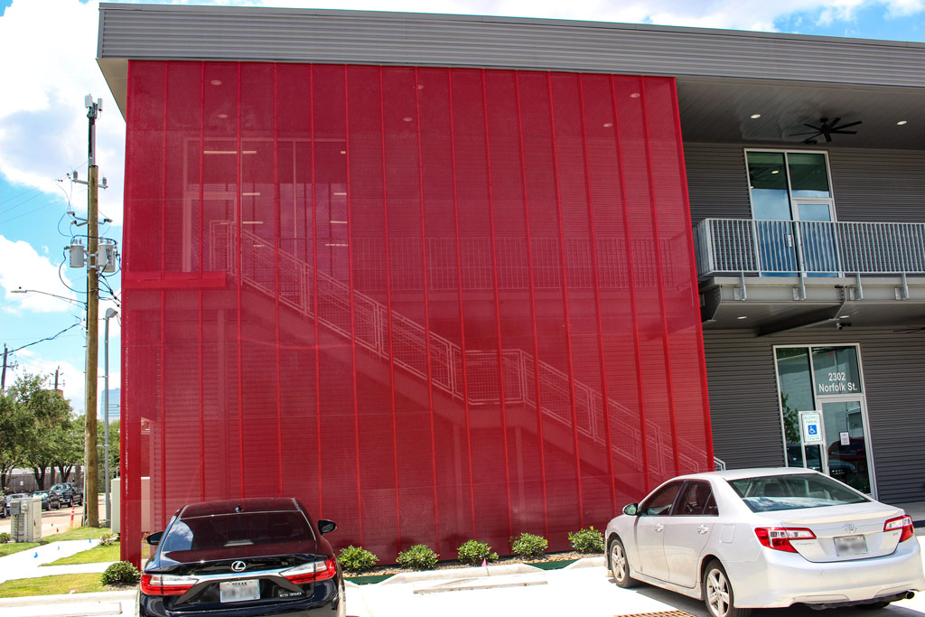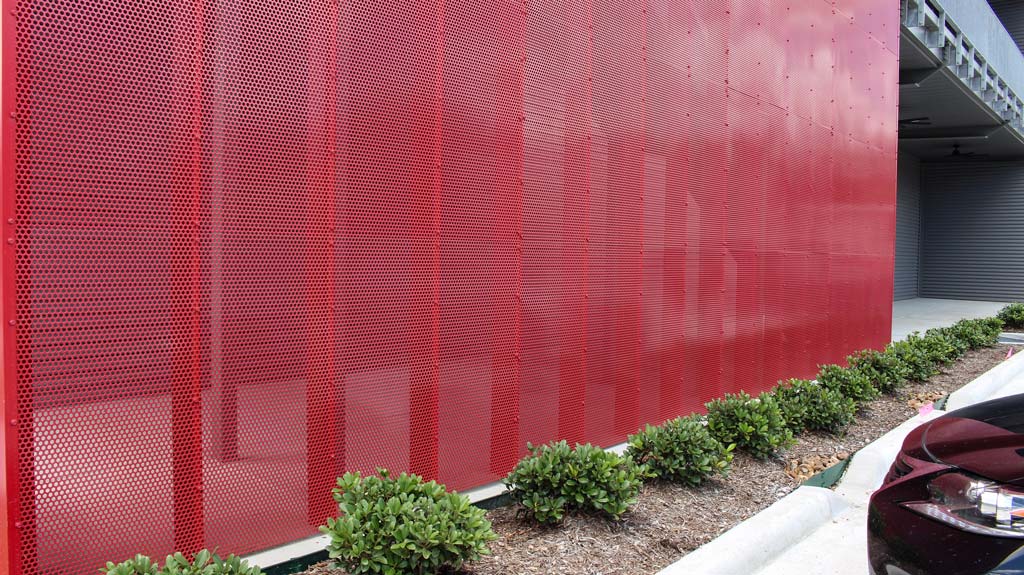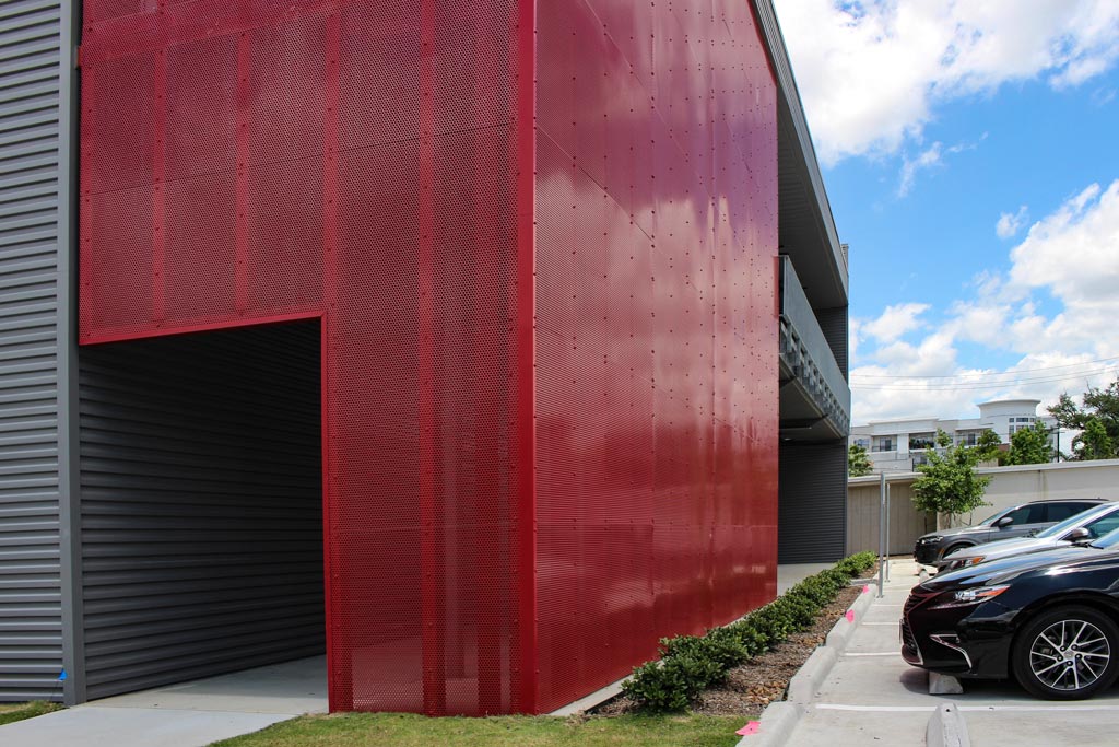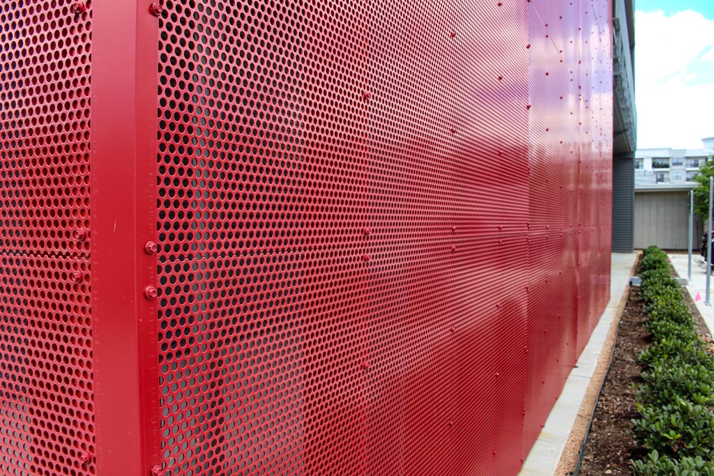 This project features custom punched and fabricated perforated metal panels designed specifically for a building application. The panels were manufactured to precise hole patterns and dimensions, then fabricated for a seamless fit and finished with a Tomato Red powder coat. Custom perforated metal adds architectural detail while providing ventilation, partial visibility, and protection, resulting in a durable, visually striking building element.